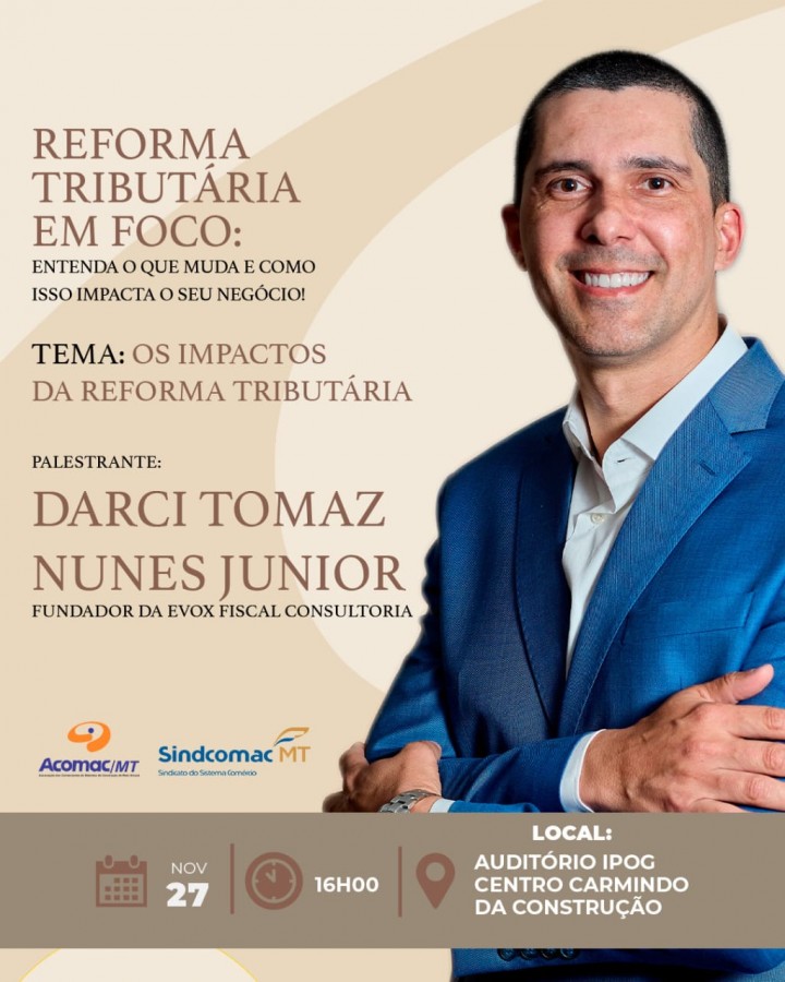 Participe da palestra “Os Impactos da Reforma Tributária” com Darci Tomaz Nunes Junior, Fundador da Evox Fiscal Consultoria e Especialista em Estratégias Tributárias.