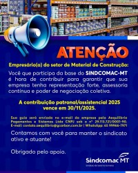 Notícias / Ações 02/12/2025 08:30 Contribuição Sindical Patronal / Assistencial 2025 de Cuiabá e Várzea Grande.